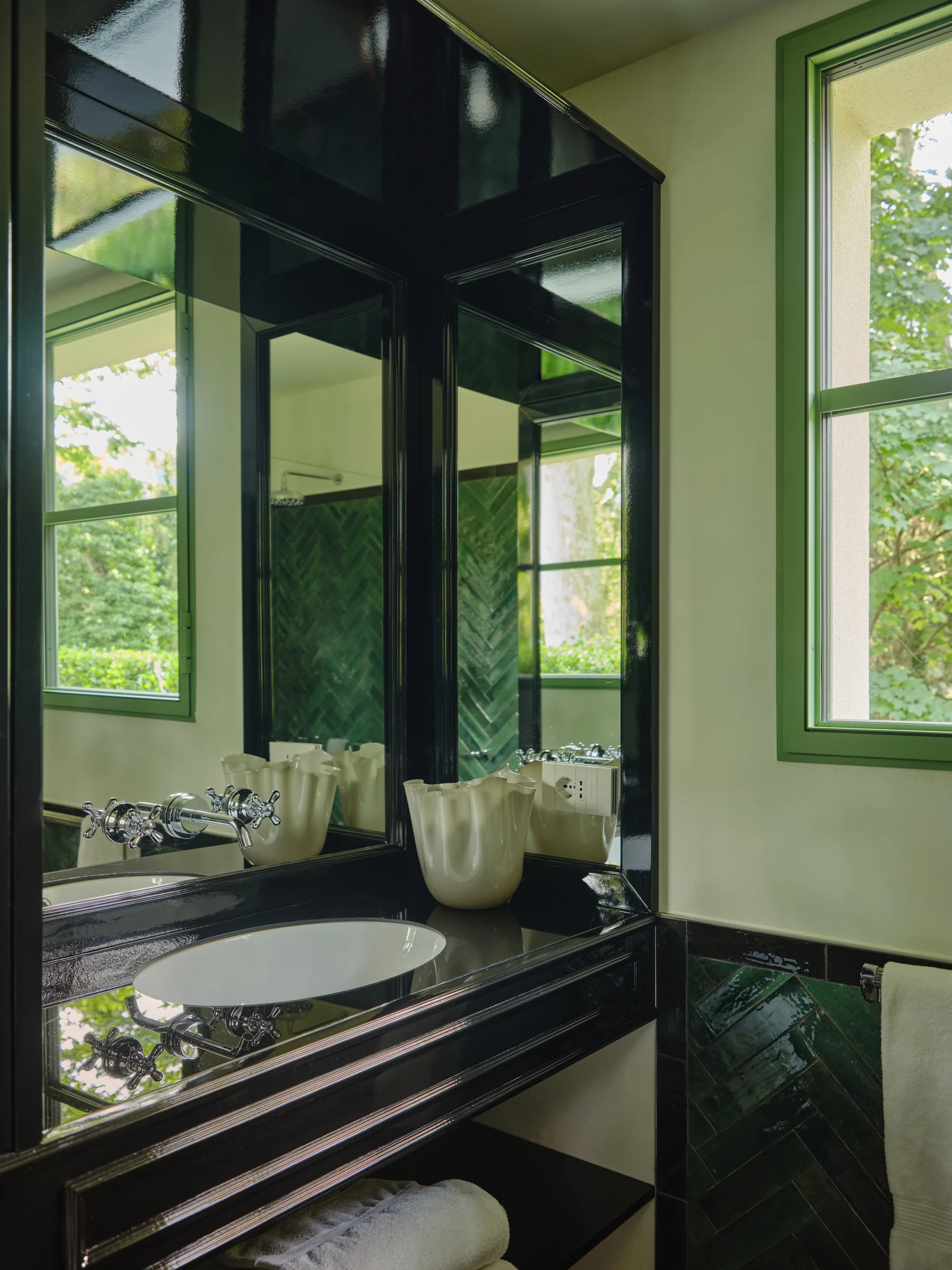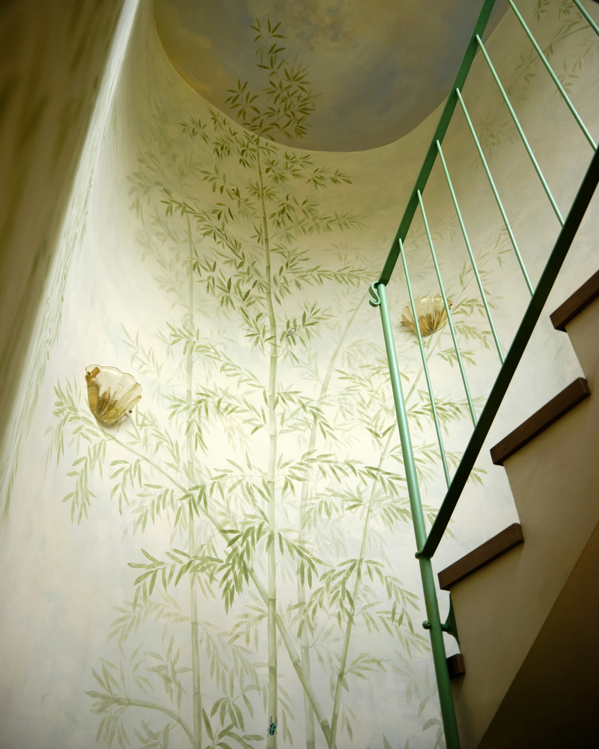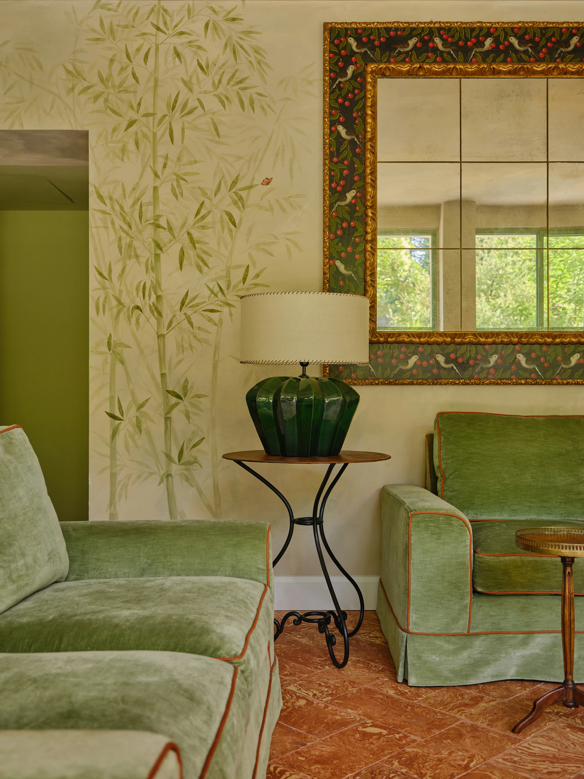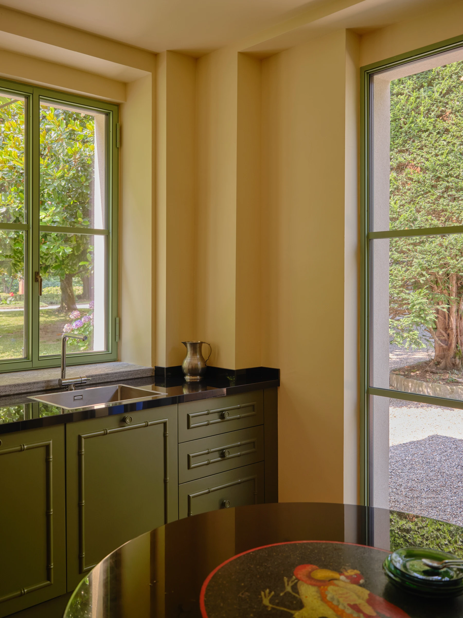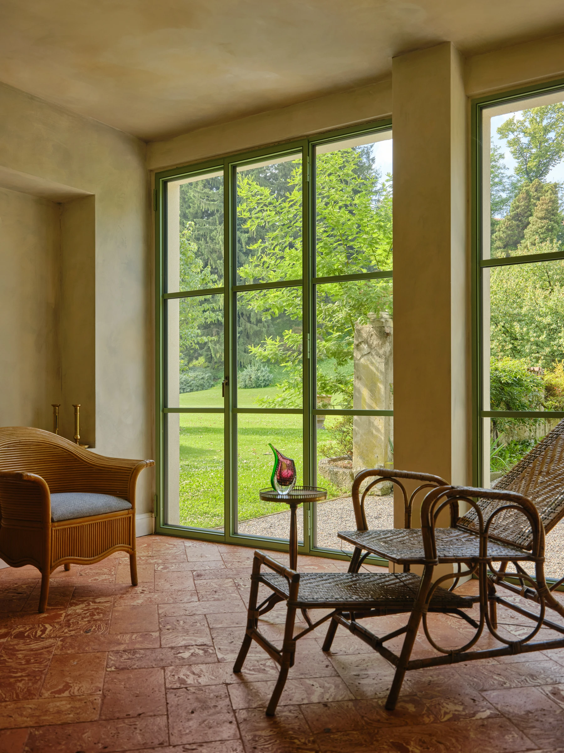 Renovation project of an old lemon house transforms the historic structure into an elegant, modern retreat while preserving its original charm. The extension with an added elevation allowed for the creation of four bedrooms, each with an en suite bathroom, along with spacious living, kitchen, and dining areas. Large iron-framed windows with muntins flood the interiors with natural light, while painted green foliage motifs on the walls evoke a sense of timeless garden beauty. Soft pastel hues, reminiscent of a fairytale, create a serene atmosphere, complemented by traditional Lombard terracotta floors in the common areas. In the sleeping quarters, warm national walnut wood brings a touch of refined luxury. The bathrooms are a minimalist’s dream, finished with smooth microcement and lacquered surfaces, offering a modern contrast to the space’s otherwise classic elegance. Each detail, from the ironwork to the handcrafted floors, reflects a balance of sophistication and comfort.